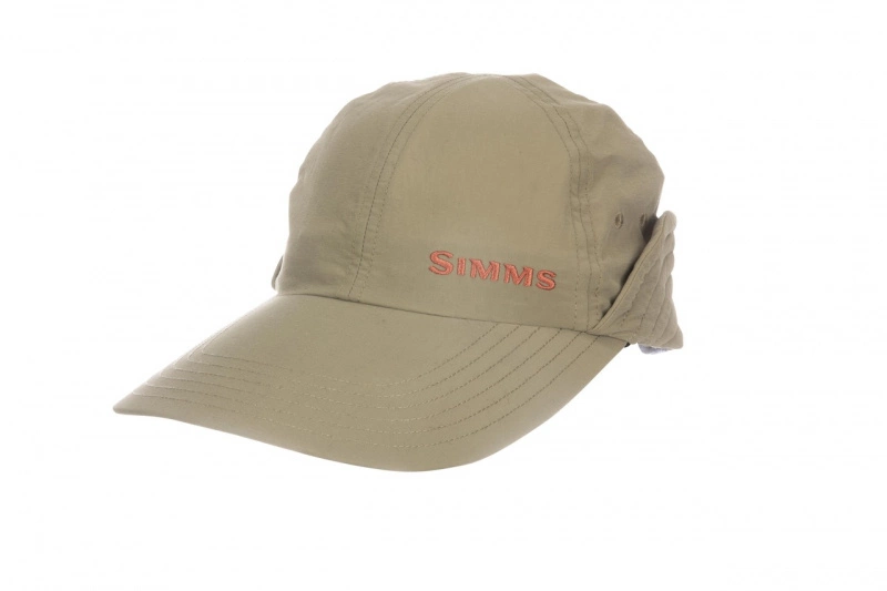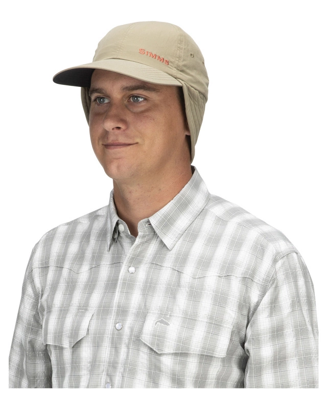 Simms Gallatin Sunshield Cap Tan is een wind en zon beschermende pet. Bedek je nek en oren in de zomerzon!